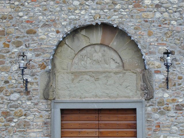 Dell’antica costruzione, infatti, rimane solo una lunetta in pietra arenaria molto danneggiata ubicata sopra il portone d’ingresso nella quale è scolpito l’ Arcangelo Michele che sconfigge il drago e in basso si può ancora leggere la data: ANNO[O]D. MCCXXIII.